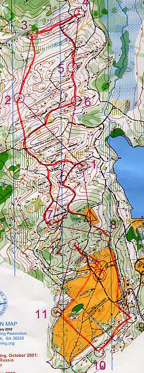 Had a good run, ran as hard as I could, didn't miss more than a few seconds. 4.87 km, 34:39. Won by about 25 seconds over Michael Wood from New Zealand. A pleasant surprise, since I thought tracks would make the course a minute or two faster as the day went on. As it turned out, the one leg I really gained time on was 5 to 6, where going right of the straight line gave me a better flow though the terrain (Michael went straight and was 50 seconds slower).
