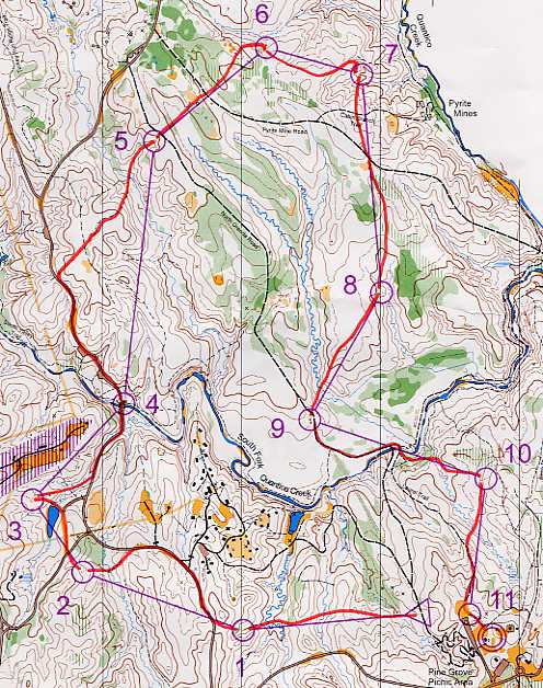 On the way to #8, trning left onto the last spur, I saw Dennis Wildfogel coming up from behind and moving very quickly. I remember thinking that I better get moving so I picked it up and was full speed into the control and for the rest of the course. Meanwhile, Dennis had suddenly disappeared. It turned out he had concluded my faster running to mean I had just left #8, so he did a u-turn to go back and look for it. The strange things we do...