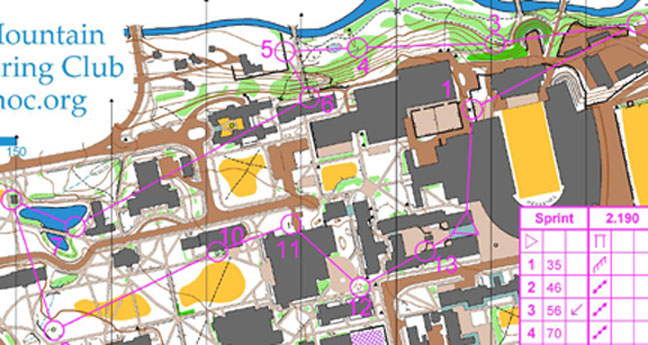 #1. I didn't expect this to be a route choice leg. The optimal route exits the passthrough going east, makes a quick north, then a quick west... (VERY quick, considering the map scale of 1:4,000.) Some people, however, started out going west as if to go to #13. I don't know whether they were following the wrong line (i.e. thought #13 was #1) or were just starting in that direction because they had seen a bunch of other people start off in that direction. (#13 on the sprint was #1 on the White course, so many people did start off in that direction.) Some people turned around & came back through the start 30 seconds later, while others exited the courtyard through the passthrough on the NW corner. Other people lost 30+ seconds at the start just standing still figuring out the route to #1 and getting used to the map.